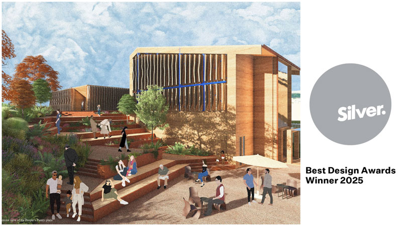 It's described as a pioneering sustainable food hub located on a reclaimed industrial brownfield in Dunedin, designed to combat food waste and food poverty through innovative, community focused architecture.